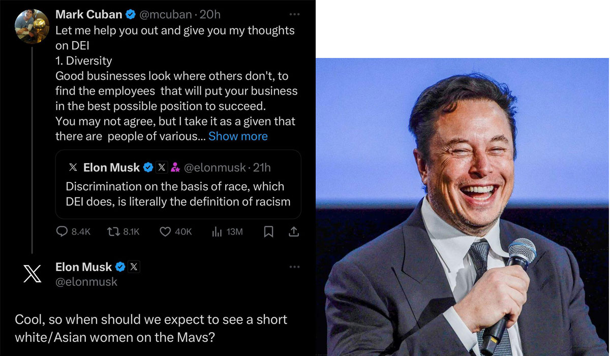 We’ll leave you with this recent tweet exchange between Elon Musk and Mark Cuban. Elon tweeted that DEI is literally discrimination to which Cuban replied: