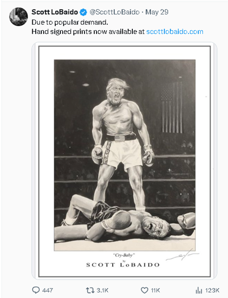 Perhaps this recent piece of art best depicts how patriots see Donald Trump and Robert DeNiro. Artist, Scott LoBaido recently unveiled his masterpiece entitled “Cry Baby.”