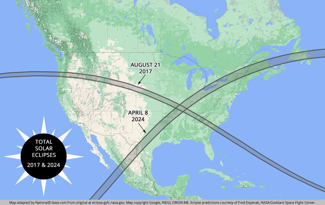 Interestingly, the last total solar eclipse in 2017 was almost a completely inverted pathway, starting from Oregon and ending in South Carolina.