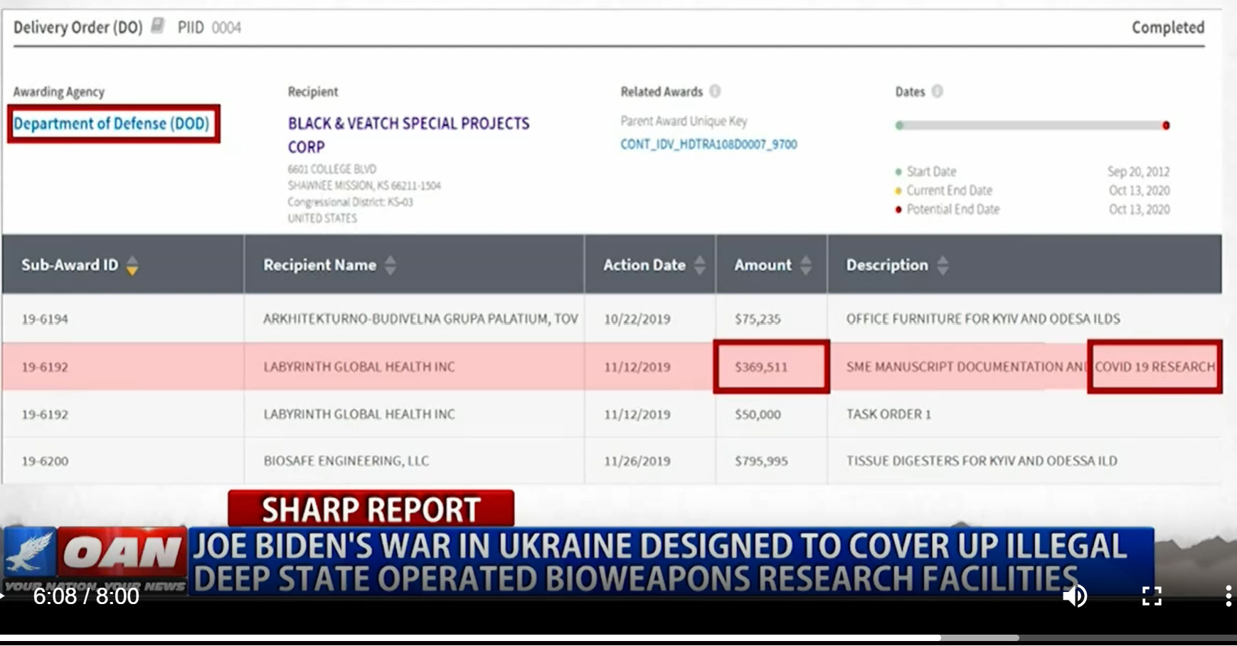 - The Department of Defense awarded $370,000 to biolabs in Ukraine for Covid19 research in November 2019.