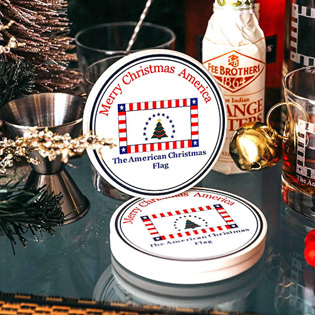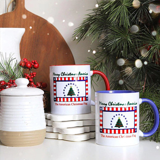The American Christmas Flag has the traditional Christmas tree front and center on the flag. Forming a semi-circle above the tree are thirteen blue stars, one star for each of the original thirteen colonies. Along the perimeter are fifty red and white stripes, one for each state. And in each corner is a white star on a field of blue, signifying the four corners of our great country, the North, the South, the East, and the West.
