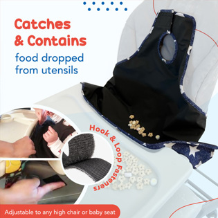 The Best Baby Bib is a food-catching bib that keeps food out of the seat, grubby hands off clothing and contains the mess at meal time. This feeding bib is easy to apply, wipes or rinses clean at the sink, and is quick-drying, so it's reusable all day, every day.
