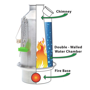 Rocket Stove or Volcano Stove - The Kelly Kettle is designed to be a rocket stove or volcano stove, boiling water ultra fast using natural fuel like sticks, grass and twigs. It works in all outdoor conditions and all elevations. This volcano stove is built like a chimney and is hollow in the middle. On the outside of this chimney is a double-walled chamber where your water "secretly" goes. With the water dispersed with all that surface area in the chimney, your water boils ultra-fast with very little fuel.