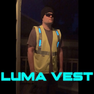 The LumaVest is a Class 2 safety vest with blue phosphor lighting on the front and back, along with 3M reflective material and a Velcro front closure. They are powered by a rechargeable USB lithium battery that lasts 11 hours on solid light mode and 24 hours on blinking mode. The LumaVest offers three different light settings: Solid, Blinking, and Strobe.