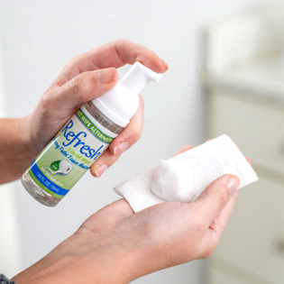 Refresh is a zero-waste, sustainable alternative that is applied directly to toilet paper as a foam to make a custom flushable wipe. Formulated with witch hazel and aloe, Refresh cleanses and soothes and promotes good hygiene.