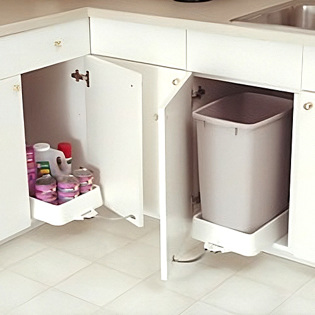 The SHELFMAID® Wastebasket Tray is designed to provide easy access to items stored in a cabinet that requires constant access. SHELFMAID® is ideal for those who like to store their wastebasket in an under-sink cabinet. SHELFMAID® will slide out of the cabinet as the door opens and slide back in as it closes, alleviating having to pull items out to access them.